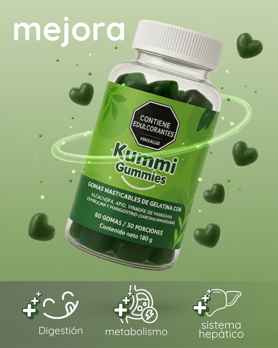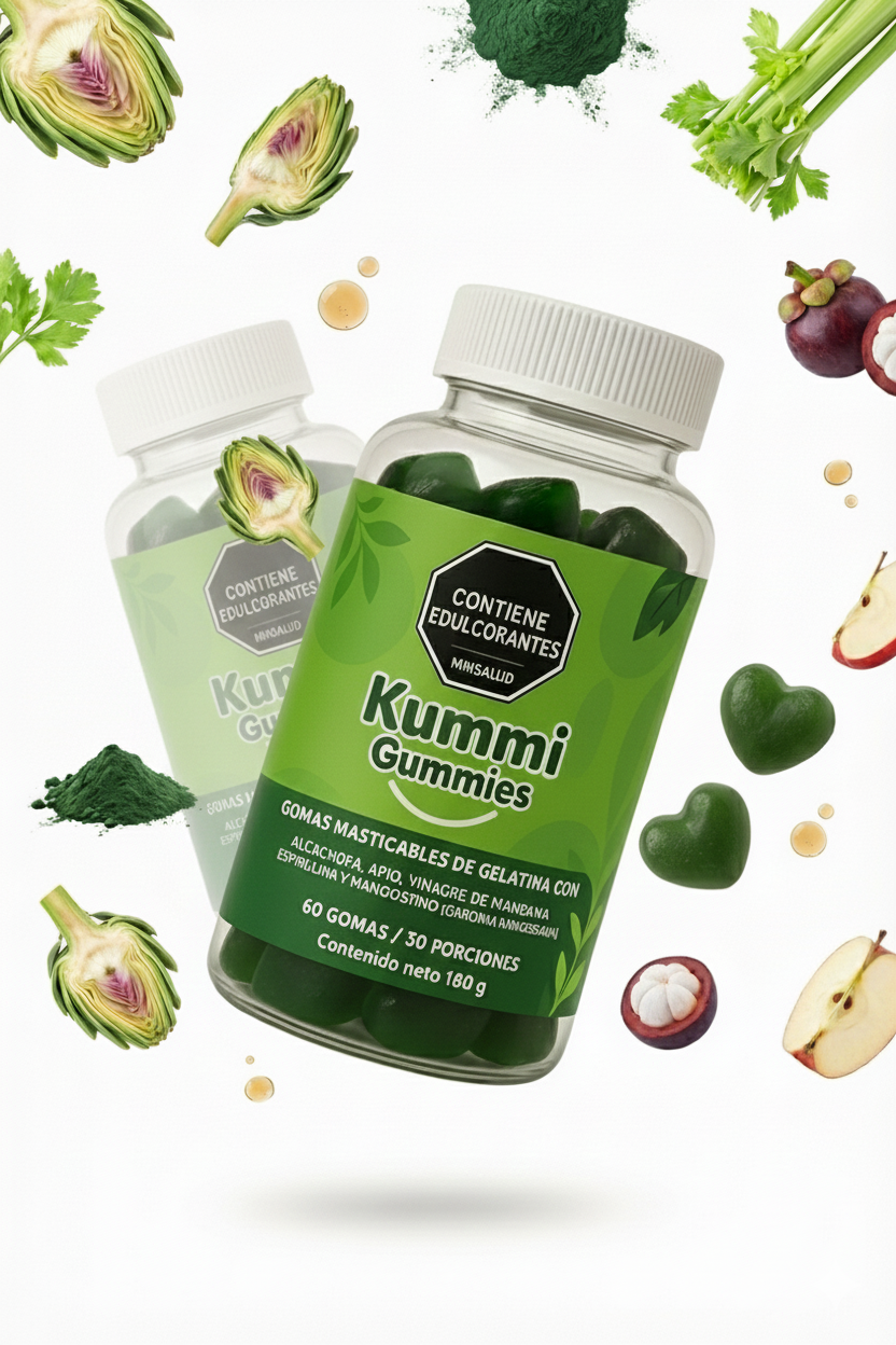 Gomas masticables con alcachofa, apio, vinagre de manzana, espirulina y mangostino que apoyan tu digestión, tu metabolismo y tu sensación de bienestar, sin complicarte la vida con más pastillas o bebidas raras.